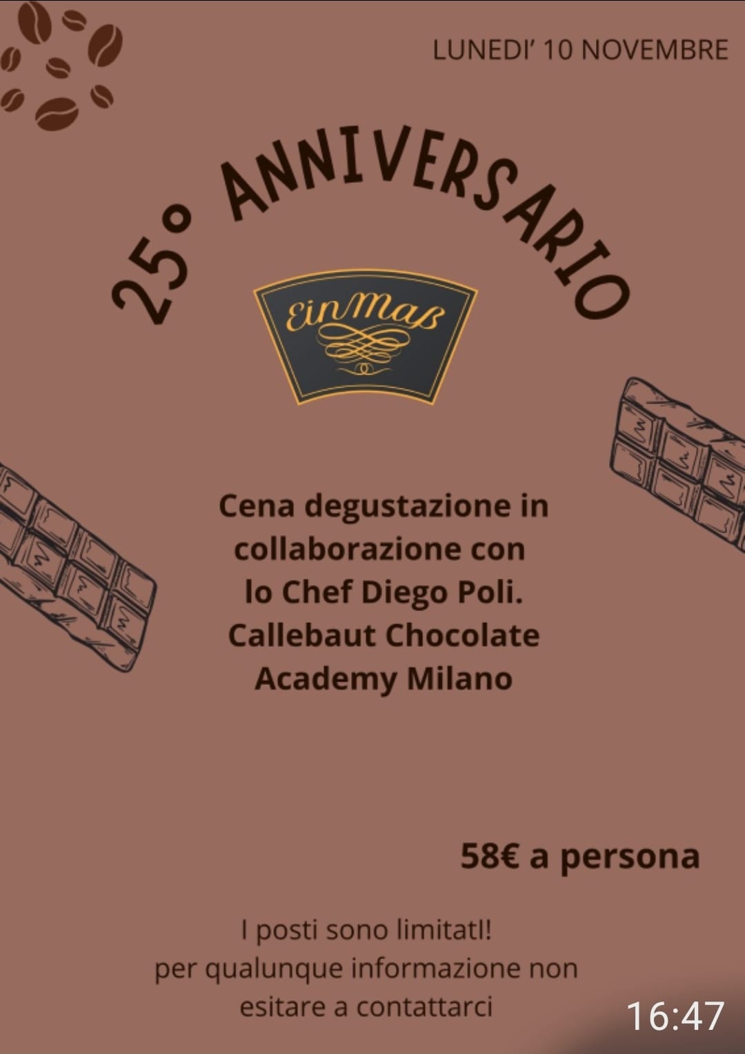 25º anniversario EINMASS Per questa occasione unica, il locale ha organizzato assieme allo Chef Diego Poli della Callebaut Chocolate Academy Milano, che firmerà una cena degustazione pensata per raccontare un viaggio di sapori attraverso il cioccolato. Siamo lieti di condividere questa esperienza culinaria esclusiva con chi ci ha sempre supportato. Data: lunedì 10 novembre Orario: 20:30 Prenotazione obbligatoria