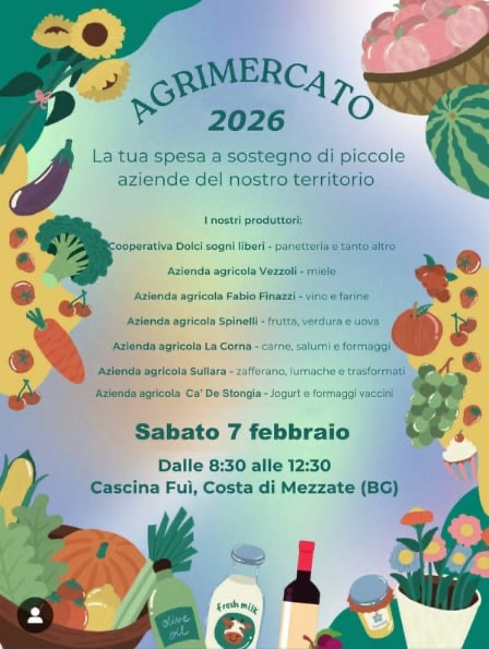 Sabato 7 febbraio 2026, dalle 8:30 alle 12:30, si svolge l’Agrimercato presso Cascina Fui, a Costa di Mezzate.