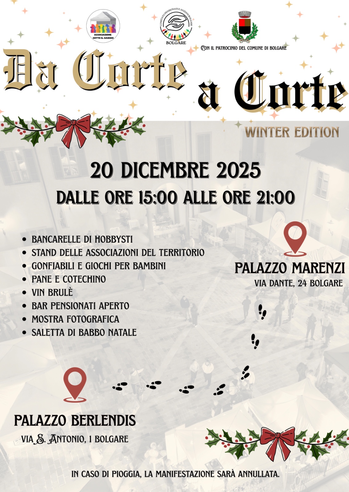 L’evento si svolgerà tra Palazzo Marenzi (via Dante, 24) e Palazzo Berlendis (via S. Antonio, 1), dove sarà possibile vivere un pomeriggio all’insegna della tradizione, della convivialità e dello spirito natalizio.