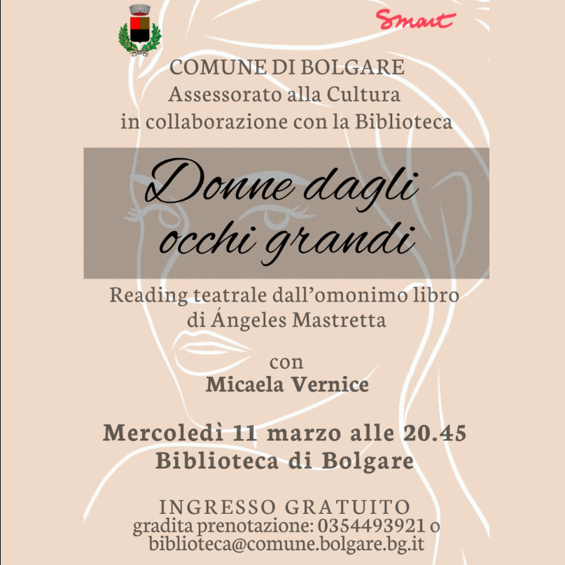 Donne dagli occhi grandi – Reading teatraleMercoledì 11 marzo alle ore 20:45, presso la Biblioteca di Bolgare, si terrà il reading teatrale Donne dagli occhi grandi, tratto dall’omonimo libro della scrittrice Ángeles Mastretta.