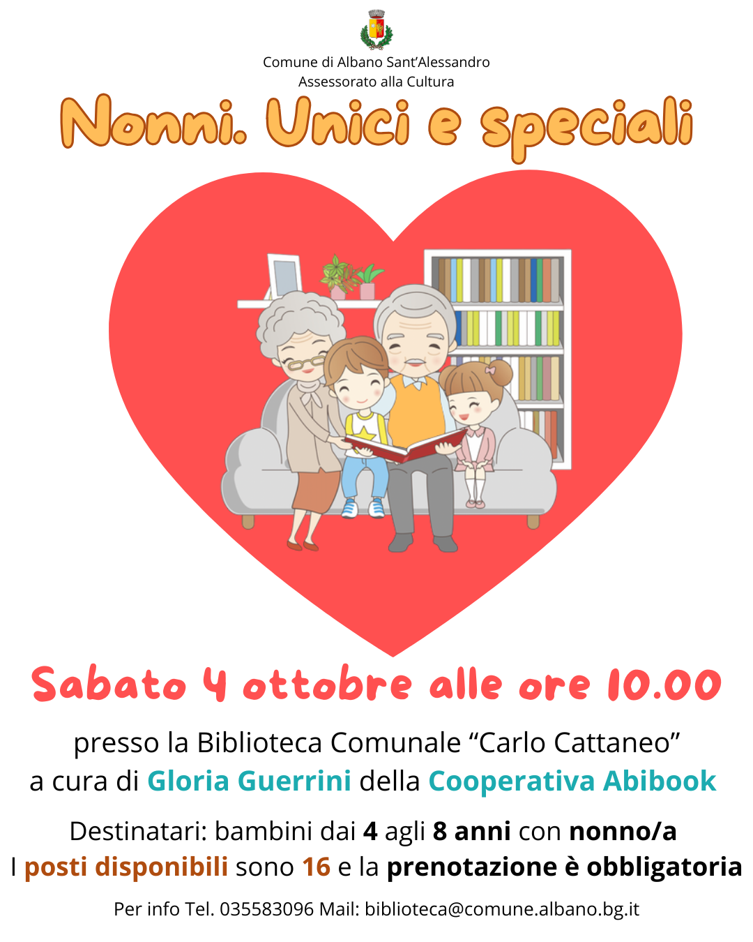 Festa dei nonni", Gloria Guerrini della Cooperativa Abibook, in collaborazione con il personale della biblioteca, accompagnerà i bambini, insieme al loro nonno o alla loro nonna, in un mondo tenero e sorprendente, fatto di bellissime storie in cui i nonni trasformeranno le giornate apparentemente normali o addirittura noiose dei loro nipotini in avventure fantastiche e straordinarie.