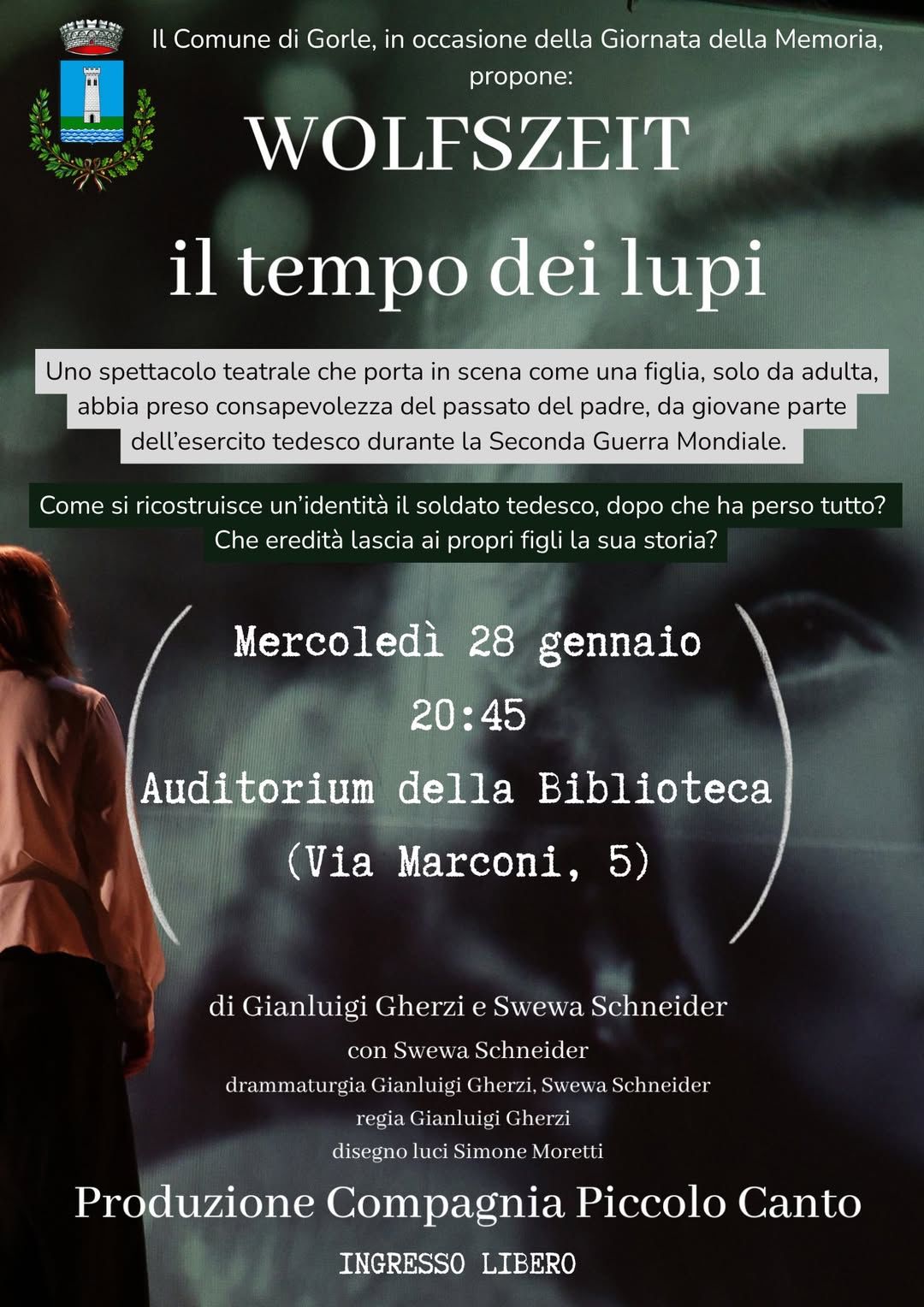 Il Comune di Gorle, in occasione della Giornata della Memoria, mercoledì 28 gennaio alle ore 20:45 propone lo spettacolo “Wolfszeit. Il tempo dei lupi”.