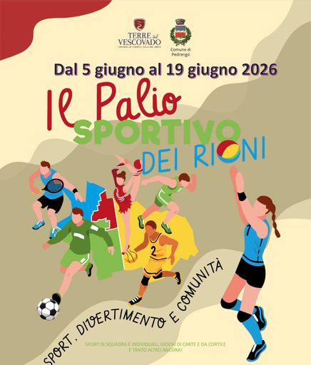 PALIO SPORTIVO DEI RIONI 2026 - PEDRENGO dal 5 al 19 giugno 2026 Il Comune di Pedrengo, in collaborazione con Terre del Vescovado, organizza il Palio Sportivo dei Rioni 2026, in programma dal 5 al 19 giugno. Un evento che promuove le attività sportive del territorio, in forma non agonistica, creando importanti momenti di aggregazione attraverso sport di squadra e individuali, giochi di carte e giochi di cortile. Un’occasione unica per vivere insieme lo sport come elemento di socialità, rafforzando il senso di appartenenza alla comunità. Per info, iscrizioni e dettagli sulle fasce d'età ed il numero di partecipanti per ogni attività, contattare i referenti dei rioni: GIOVANNI MANZONI: 3482740756 LAURA BIANCHI: 3341213885 LUCIO GUARIGLIA: 3333370139 ALESSANDRA PATELLI: 3494909867 CLICCA QUI per visualizzare il volantino con il regolamento, l'elenco dei rioni e il calendario di tutte le attività previste.