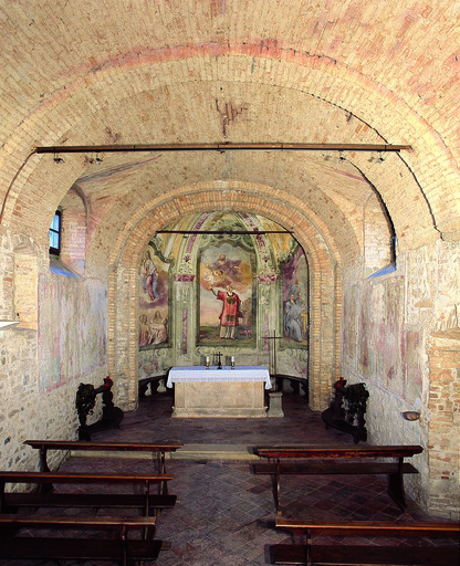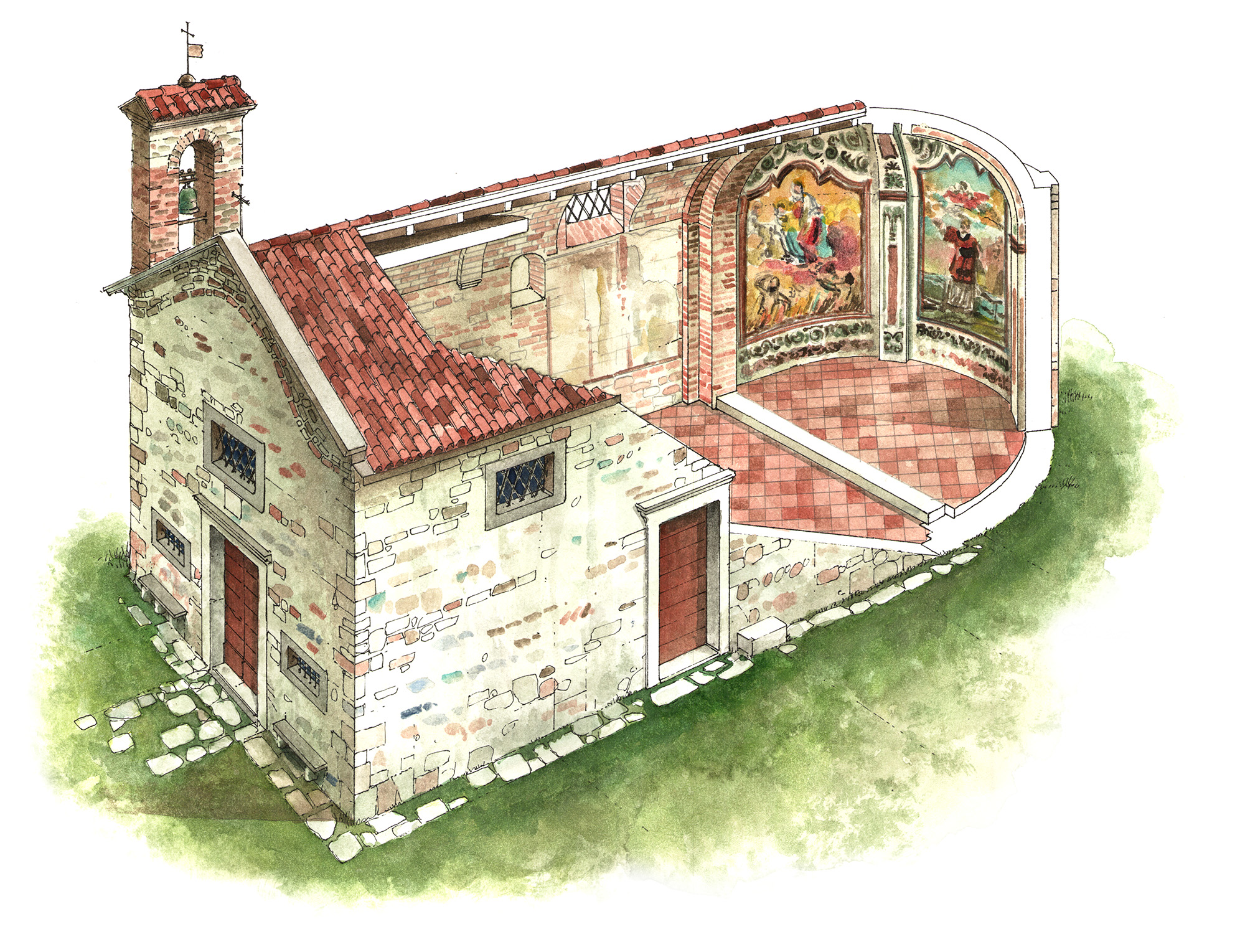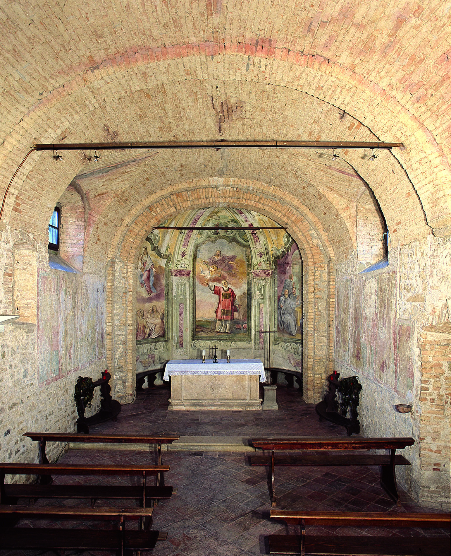 L’edificio si caratterizza per le semplici pareti costruite in pietra locale e la solida volta in mattoni su cui poggia una copertura in coppi. I colori brillanti e la composizione aggraziata esaltano le figure dei santi, tra i quali spicca San Lorenzo in Gloria.