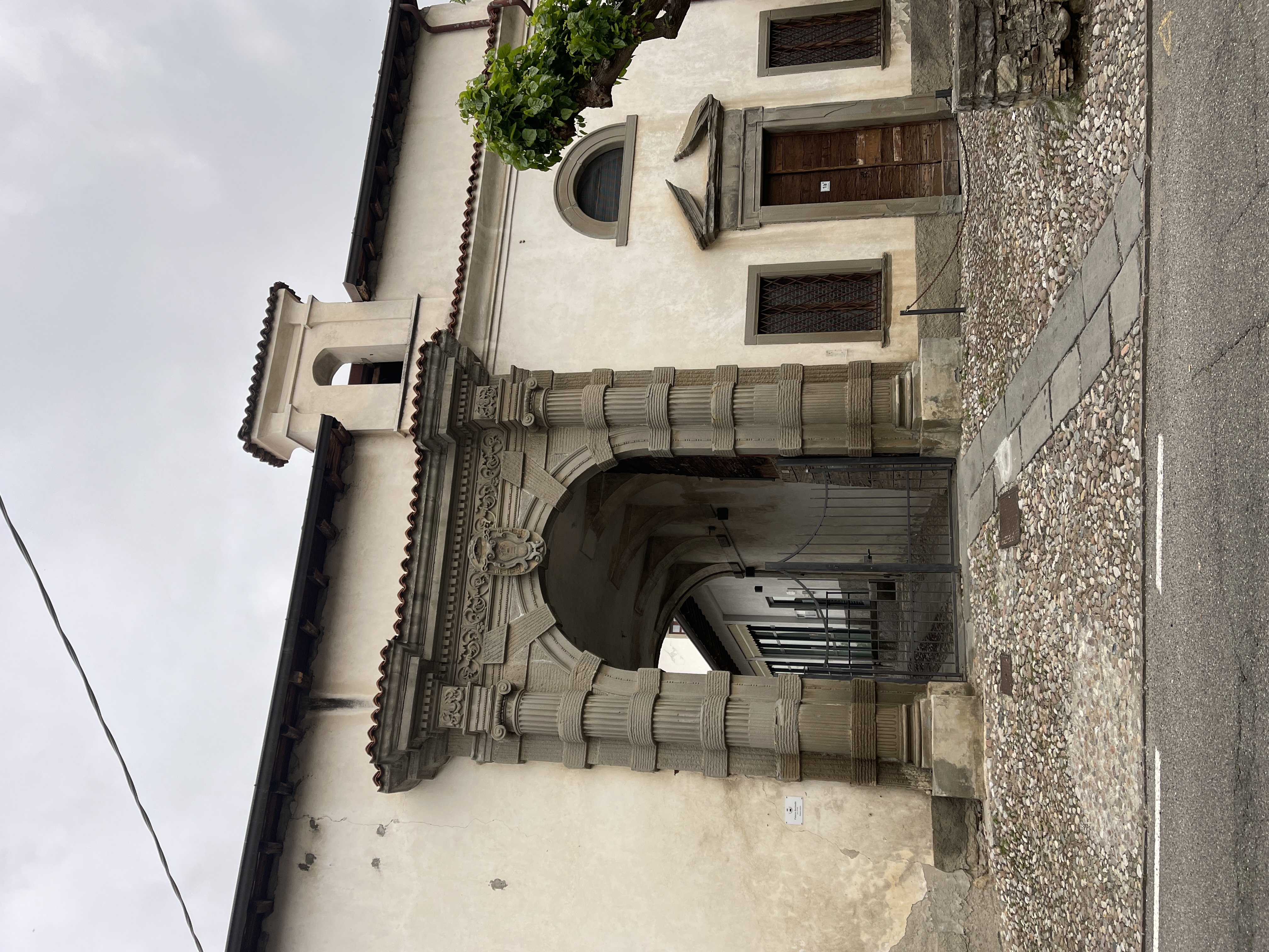 Varcando il portale, si accede a un ampio androne che introduce alla corte interna, delimitata da edifici rustici tra cui spicca una scuderia a tre navate con colonne toscane e volte a crociera, un elemento architettonico di eccezionale rarità nel territorio bergamasco. La dimora signorile vera e propria si eleva sul lato opposto con una facciata asimmetrica su tre livelli, arricchita da balconi in pietra al piano nobile. Una scala interna con tracce di affreschi divide l'edificio in due sezioni: a sinistra si trova il nucleo più antico, riconoscibile dalla torre colombaia che svetta sul retro, mentre a destra si sviluppa l'area di rappresentanza composta da tre grandi sale riccamente decorate.
