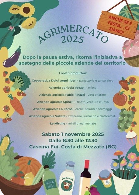 Agrimercato in Cascina Fuì Sabato 6 settembre dalle 8:30 alle 12:30 La tua spesa a sostegno di piccole aziende del nostro territorio Sarà presente un’accurata selezione di produttori locali con specialità fresche e artigianali: Cooperativa Dolci sogni liberi – panetteria e molto altro Azienda agricola Vezzoli – miele Azienda agricola Fabio Finazzi – vino e farine Azienda agricola Spinelli – frutta, verdura e uova Azienda agricola La Corna – carne, salumi e formaggi Azienda agricola Sullara – zafferano, lumache e trasformati Le Mirtillle – mirtilli e marmellate Un’occasione per fare la spesa in modo consapevole, sostenendo le realtà agricole del nostro territorio.