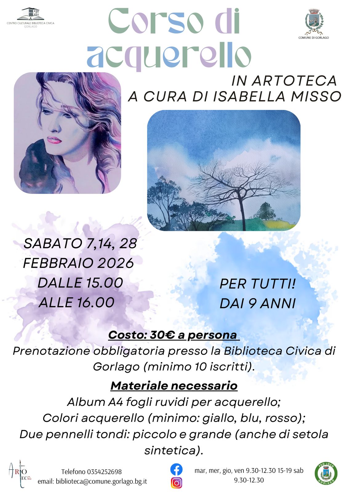 Il Centro Culturale Biblioteca Civica di Gorlago presenta un corso di acquerello in Artoteca a cura di Isabella Misso.