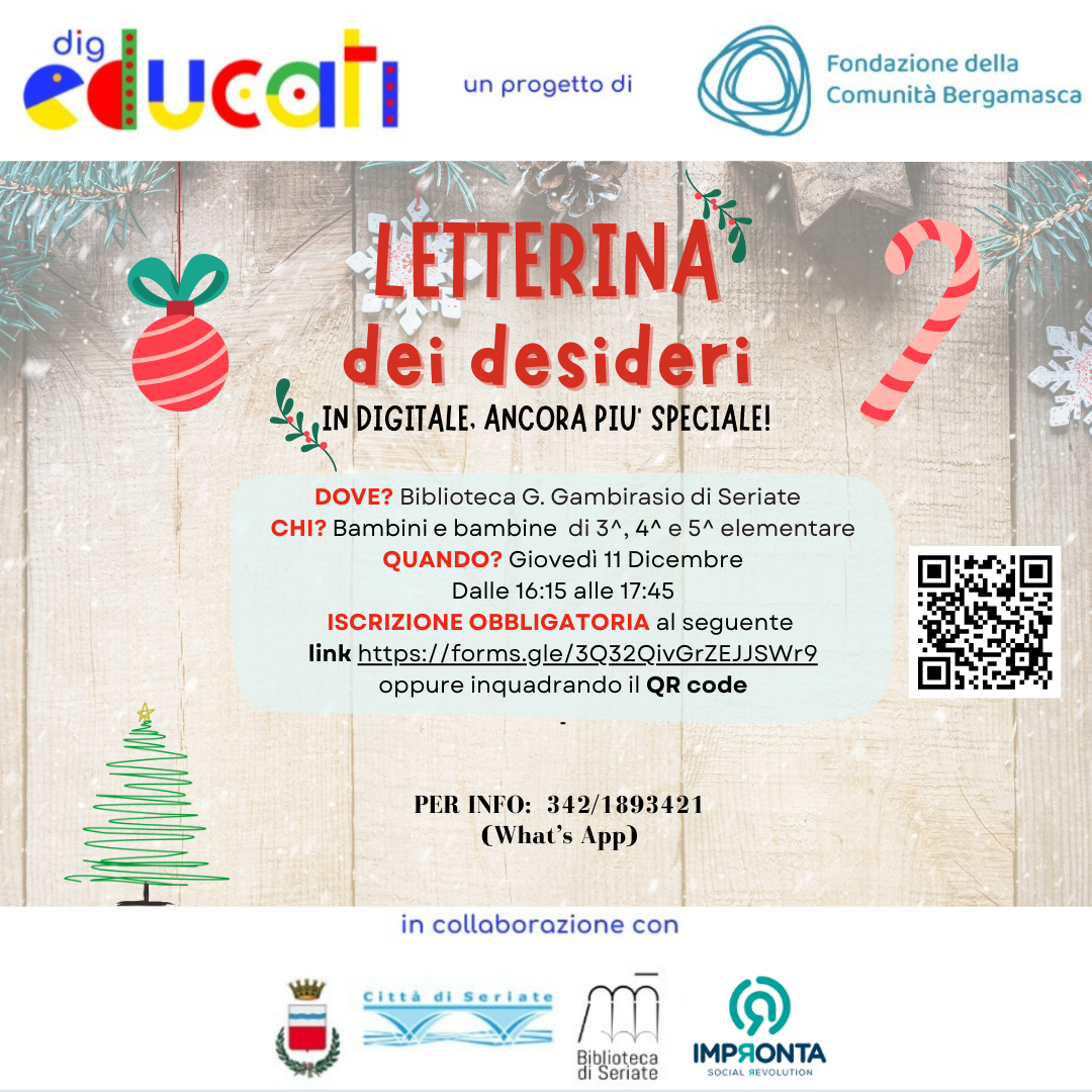 Laboratorio Digeducati per bambini della scuola primaria In questo laboratorio speciale, i bambini e le bambine potranno scrivere la loro Letterina dei Desideri in un formato del tutto digitale, rendendola ancora più unica e interattiva. Giovedì 4 dicembre dalle 16:15 alle 17:45 per bambini e bambine di 1° e 2° della scuola primaria ISCRIZIONE OBBLIGATORIA
