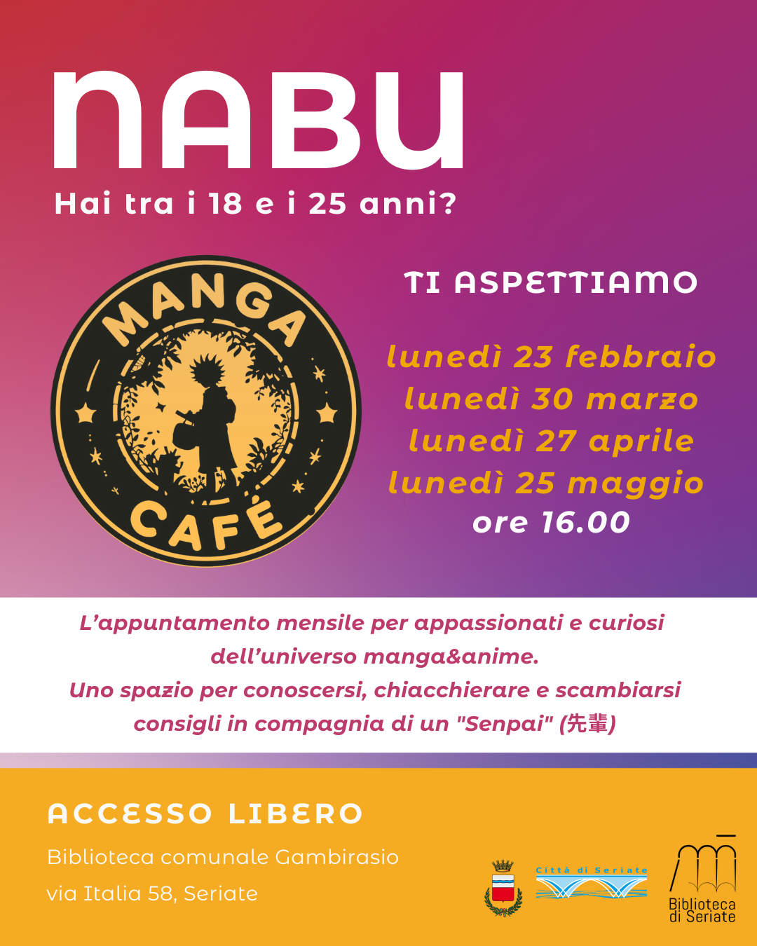 MANGA CAFE' L'appuntamento mensile per appassionati e curiosi dell'universo manga&anime. Uno spazio per conoscersi, chiacchierare e scambiarsi consigli in compagnia di un "Senpai" (先輩) L'evento è gratuito, l'accesso è disponibile fino ad esaurimento posti.
