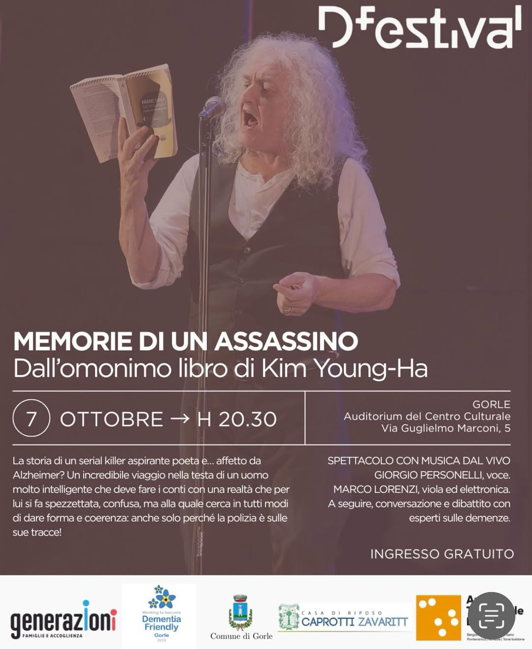 Lo spettacolo vedrà protagonista la voce di Giorgio Personelli, accompagnato dalla musica dal vivo di Marco Lorenzialla viola ed elettronica. Al termine, seguirà un momento di conversazione e dibattito con esperti sul tema delle demenze.