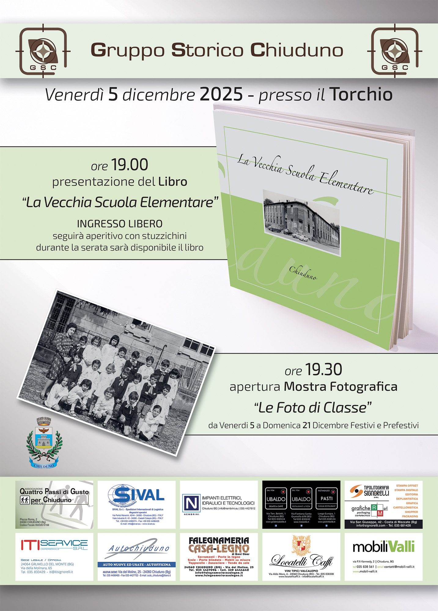 Venerdì 5 dicembre 2025, presso il Torchio, il Gruppo Storico Chiuduno organizza una serata dedicata alla presentazione del libro La Vecchia Scuola Elementare . L’incontro avrà inizio alle o re 19.00 e l’ingresso sarà libero . Durante la serata sarà possibile acquistare il volume. Al termine della presentazione è previsto un aperitivo con stuzzichini. Alle ore 19.30 è prevista l’apertura della mostra fotografica Le Foto di Classe , visitabile da venerdì 5 a domenica 21 dicembre nei giorni festivi e prefestivi. L’iniziativa offre l’occasione di approfondire la storia locale attraverso testimonianze e immagini legate alla scuola elementare di Chiuduno.