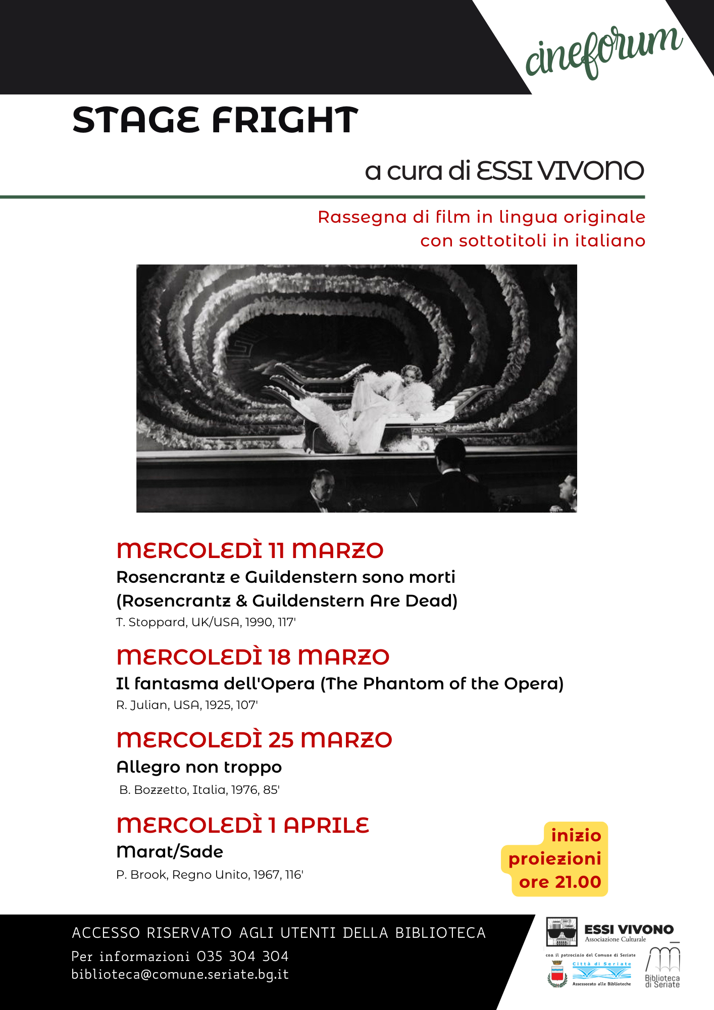 CINEFORUM – STAGE FRIGHT A cura di ESSI VIVONO Un nuovo appuntamento con il grande cinema in lingua originale con sottotitoli in italiano. Un percorso tra teatro, musica e spettacolo, dove il palcoscenico diventa protagonista di storie intense, ironiche e visionarie. Programma delle proiezioni – ore 21.00 11 marzo Rosencrantz e Guildenstern sono morti (T. Stoppard, UK/USA, 1990 – 117’) Una brillante e surreale rilettura dell’Amleto shakespeariano, tra ironia e riflessioni esistenziali. Le proiezioni si terranno presso la Biblioteca. Accesso riservato agli utenti della biblioteca. Per informazioni: 035 304 304 biblioteca@comune.seriate.bg.it