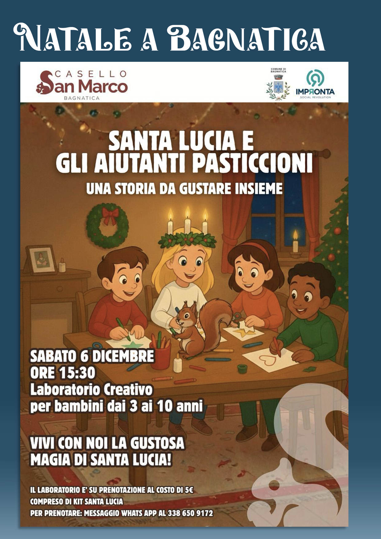 Santa Lucia e gli Aiutanti Pasticcioni – Una storia da gustare insiemeNel cuore delle festività natalizie, Casello San Marco, insieme al Comune di Bagnatica e a Impronta Social Revolution, propone un pomeriggio dedicato ai più piccoli per vivere la tradizione di Santa Lucia in un modo coinvolgente e creativo.