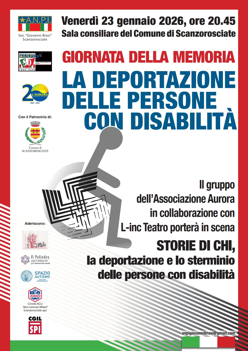 L’iniziativa nasce dalla collaborazione tra Associazione Aurora e L-INC Teatro, con il coordinamento e la cura di ANPI Scanzorosciate, con l’obiettivo di approfondire una pagina della storia spesso poco conosciuta: la persecuzione, la deportazione e lo sterminio delle persone con disabilità durante il periodo nazista.