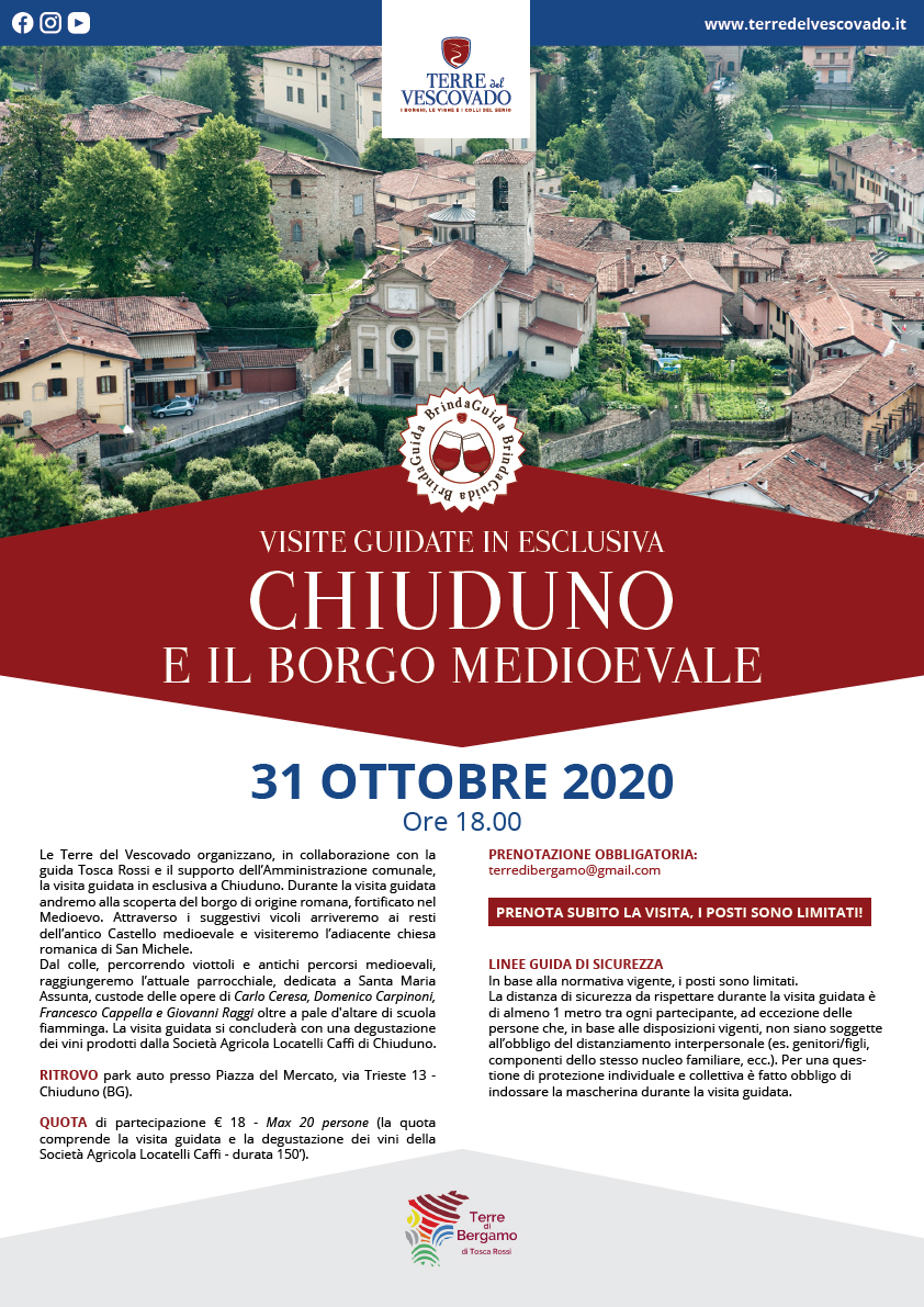 andremo alla scoperta del borgo di origine romana, fortificato nel Medioevo. Attraverso i suggestivi vicoli arriveremo ai resti dell’antico Castello medioevale e visiteremo l’adiacente chiesa romanica di San Michele. Dal colle, percorrendo viottoli e antichi percorsi medioevali, raggiungeremo l’attuale parrocchiale, dedicata a Santa Maria Assunta, custode delle opere di Carlo Ceresa, Domenico Carpinoni, Francesco Cappella e Giovanni Raggi oltre a pale d'altare di scuola fiamminga. La visita guidata si concluderà con una degustazione dei vini prodotti dalla Società Agricola Locatelli Caffi di Chiuduno.