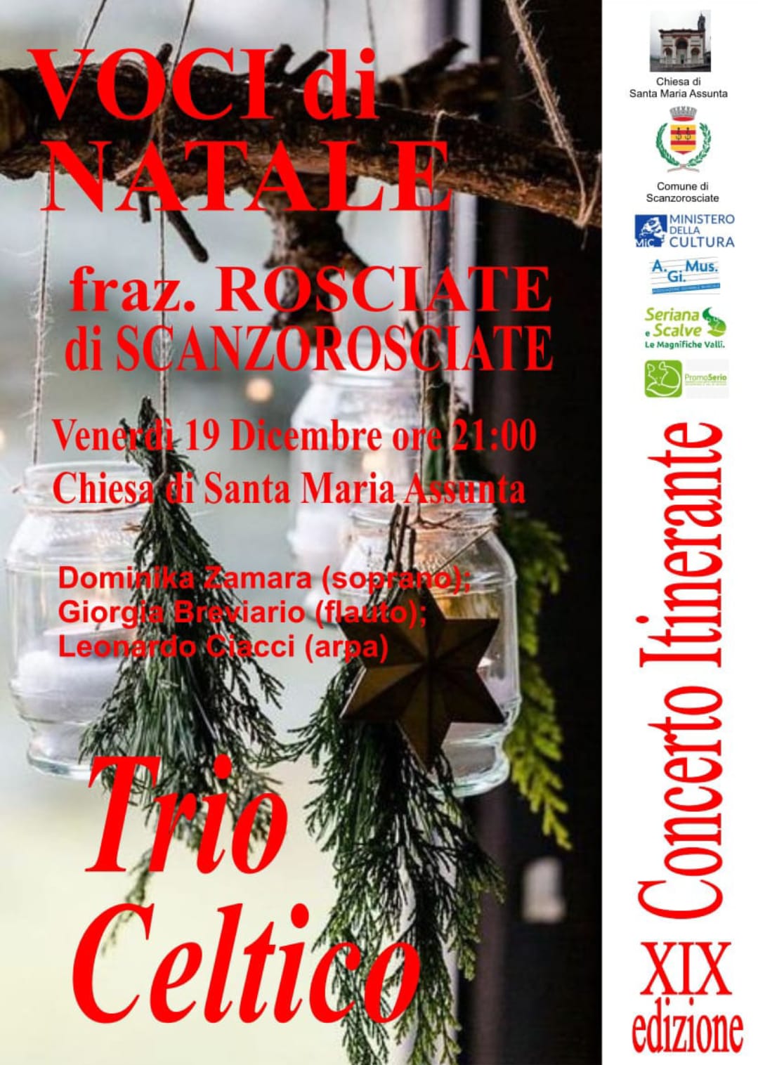 Rassegna Concerto Itinerante – XIX edizione venerdì 19 dicembre alle ore 21:00 presso la Chiesa di Santa Maria Assunta (Rosciate) La serata propone un percorso musicale natalizio affidato al Trio Celtico, formato da Dominika Zamara (soprano), Giorgia Breviario (flauto) e Leonardo Ciacci (arpa), in un’atmosfera intima e suggestiva, pensata per valorizzare il periodo delle festività. L’evento è aperto al pubblico ed è un’occasione per vivere la musica dal vivo in un contesto raccolto e ricco di tradizione.