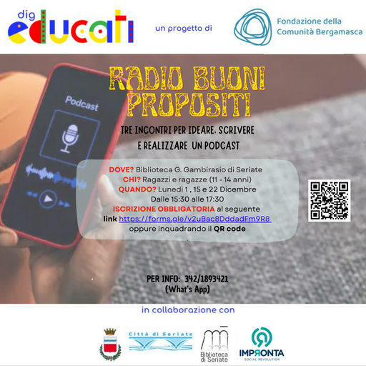 Un percorso di tre incontri dedicato a ragazzi e ragazze (11-14 anni) che per imparare a ideare, scrivere e realizzare il proprio podcast: trasformeremo desideri e speranze per il nuovo anno in una vera e propria radio di buoni propositi! Lunedì 1, 15 e 22 dicembre dalle 15:30 alle 17:30 ISCRIZIONE OBBLIGATORIA DigEducati è un progetto di Fondazione della Comunità Bergamasca in collaborazione con Comune di Seriate Biblioteca Seriate e L'Impronta Cooperativa Sociale CONTATTO TELEFONICO 3421893421 CONTATTO MAIL biblioteca@comune.seriate.bg.it