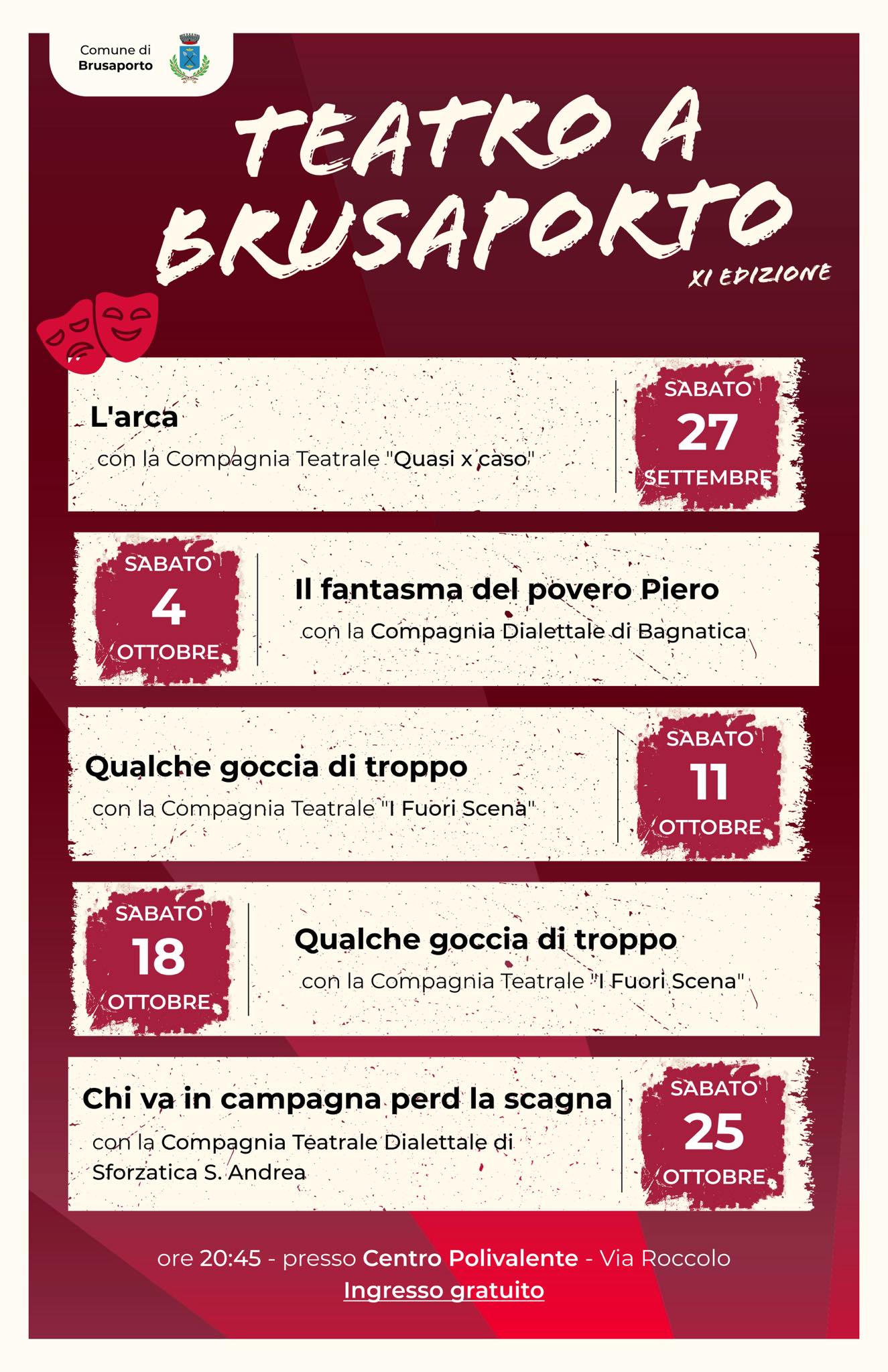 TEATRO A BRUSAPORTO Undicesima edizione della rassegna teatrale Teatro a Brusaporto organizzata dall’Amministrazione comunale. Quattro compagnie, cinque spettacoli per tante emozioni e risate. Gli spettacoli si svolgeranno presso il Centro Polivalente alle ore 20:45, l’ingresso è gratuito. Si parte con i Quasixcaso che portano in scena “L’arca” per la regia di Massimo Nicoli sabato 27 settembre 2025. Segue sabato 4 ottobre 2025 la Compagnia Dialettale di Bagnatica con la commedia in dialetto bergamasco “Il fantasma del povero Piero” di Camillo Vittici. Sabato 11 e 18 ottobre 2025 è il turno de I fuori scena con la commedia italo-dialettale “Qualche goccia di troppo” di Giuseppina Cattaneo. Chiude la rassegna sabato 25 ottobre 2025 la Compagnia teatrale dialettale di Sforzatica S. Andrea che mette in scena la commedia dialettale “Chi va in campagna perd la scagna”.